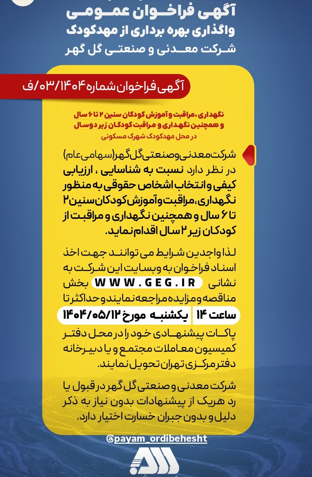 فراخوان عمومی واگذاری بهره برداری از مهدکودک گل گهر
