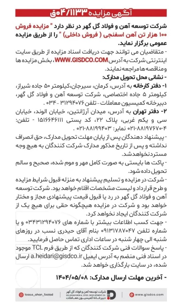 مزایده فروش ۱۰۰ هزار تن آهن اسفنجی(فروش داخل) شرکت توسعه آهن و فولاد گل گهر |
