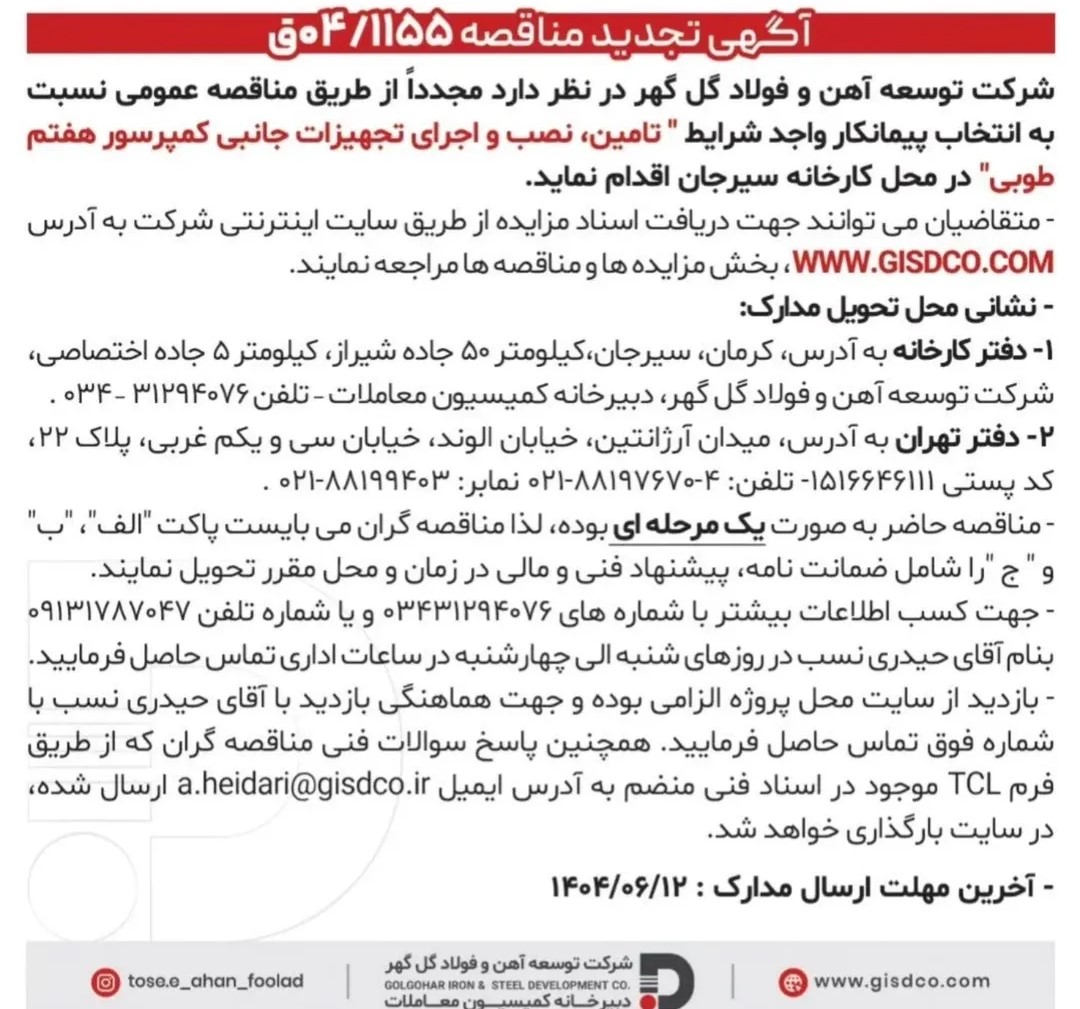 آگهی تامین، نصب و اجرای تجهیزات جانبی کمپرسور هفتم طوبی (2) شرکت توسعه آهن و فولاد گل گهر تامین، نصب و اجرای تجهیزات جانبی کمپرسور هفتم طوبی (2) |
