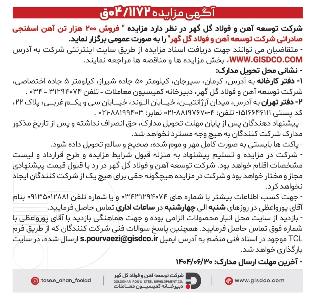 آگهی فروش 200 هزار تن آهن اسفنجی صادراتی شرکت توسعه آهن و فولاد گل گهر