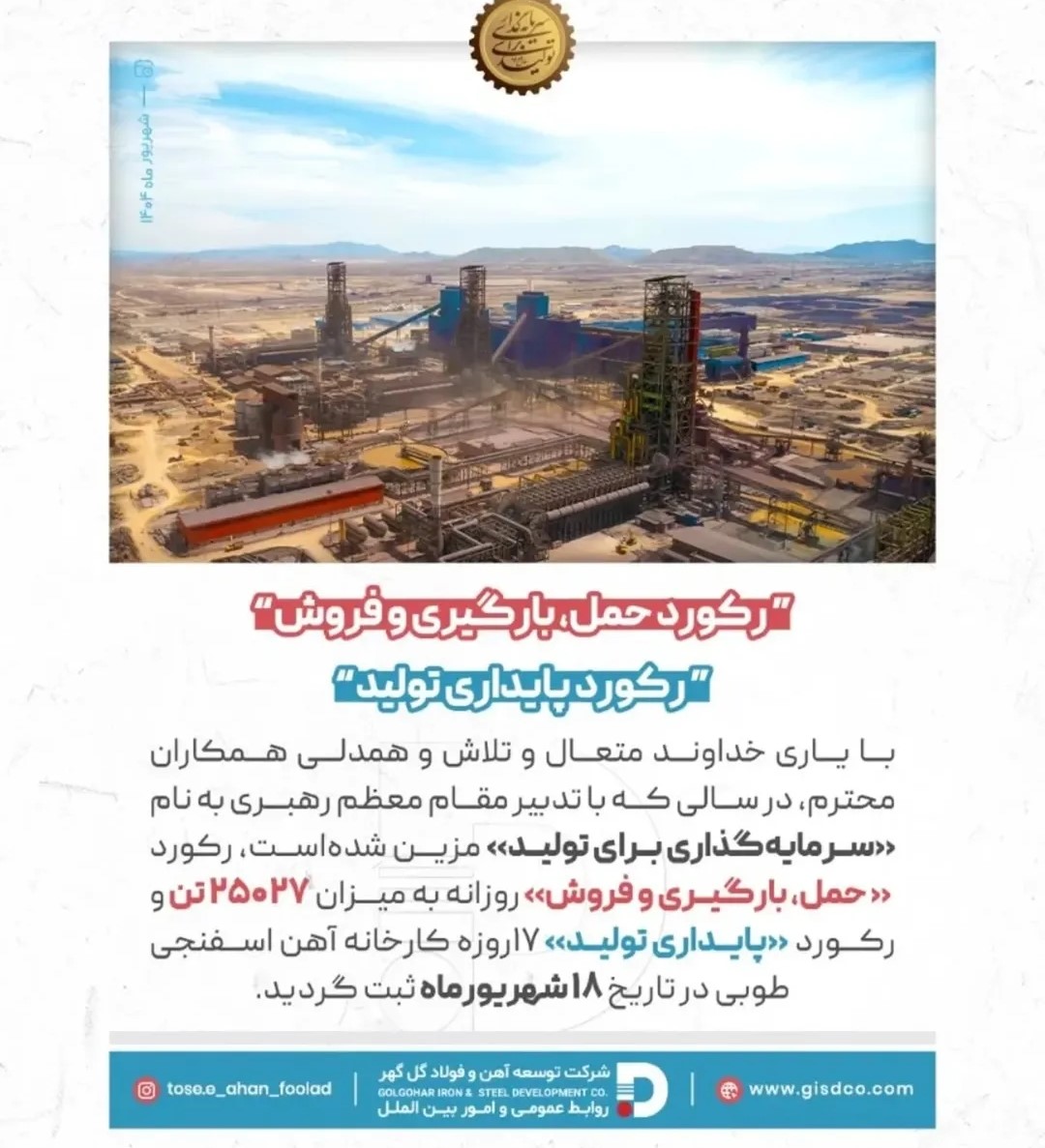 رکورد حمل بارگیزی و فروش شرکت توسعه آهن و فولاد گل گهر در 18 شهریور |